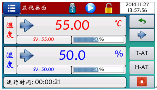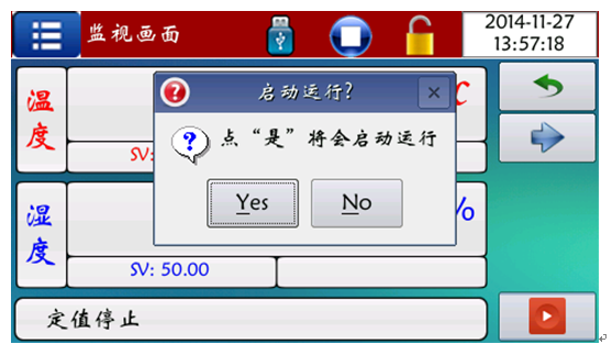 此時注意儀表應處于定值停止狀態,畫面中右上角鎖如處于鎖定狀態時,儀表設定值不能修改,如需修改需點擊鎖,然后輸入密碼“0”即可解鎖,在此畫面下分別點擊溫度/濕度“SV”將其改為試驗所需要的溫濕度即可,當設定完畢后,點擊此界面右下角按鈕,彈出運行對話框,點擊確定設備即開始運行,界面如下:
